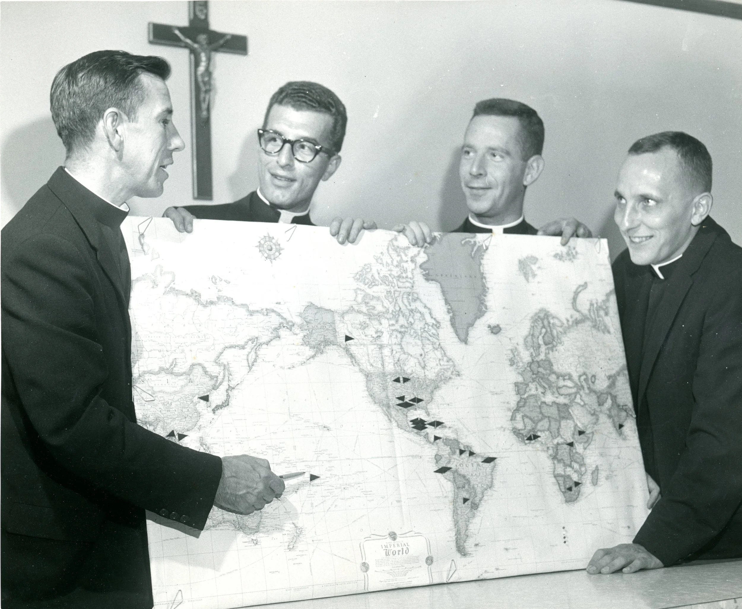 Priests around a map of Archdiocese of Milwaukee Missionaries, 1962. Courtesy of the Archdiocese of Milwaukee Archives.